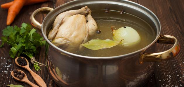 - إضافة الدجاج وتركه الدجاج يغلي إلى أن يتم تكوين الرغوة، والتخلص منها باستعمال ملعقة ذات ثقوب.