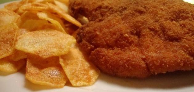 • نخرج قطع اللّحم ونُغلّفها بالبقسماط من الجهتين، ثمّ نضع اللّحم في الثلّاجة لمدّة نصف ساعة كي لا يتفتّت في الزّيت إذا قُليَ مُباشرةً.