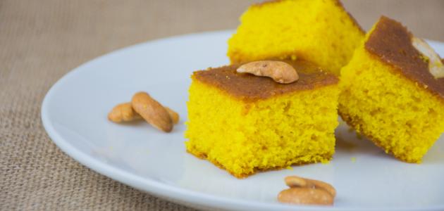• خلط السميد الناعم مع الطحين، السكر، الكركم، والبيكينج باودر في وعاء كبير وإضافة رشة صغيرة من الملح إلى الخليط.