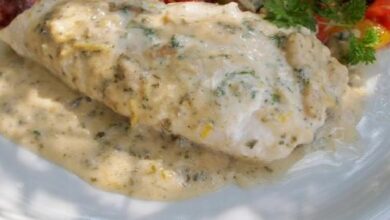 • توزيع الخليط فوق شرائح الفيليه المحشية بالخضار في الطبق، وترتيب شرائح الليمون فوق الفيليه.