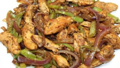 • توزيع الصلصة على الدجاج والخضروات الموجودة في الطبق.