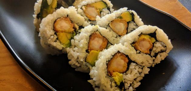 • وضع شرائح الدجاج في منتصف الشريحة على الأرز ثمّ وضع الأفوكادو، وشرائح الجزر.