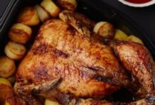 - اتركيه بالفرن لمدّة ساعة ونصف حتّى ينضج تماماً، ثمَّ انزعي الغطاء وورق الفويل عنه، وحمِّريه من الأعلى.