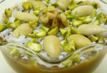 - وضع مقدار من القشطة في وسط وردة القطايف، وتوزيع القليل من الشيرة فوقها، ورش القليل من الفستق الحلبي مع بضع من ورقات من ورق الليمون.