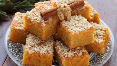 - نخرج الكيك من الفرن، ونتركه حتى يبرد، ثمّ نقطّعه ونقدّمه إلى جانب القهوة التركيّة أو العصير الطازج.
