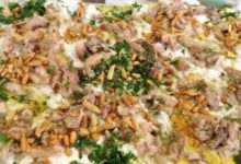 - إضافة الشفلور المقلي إلى خليط اللبن وتقليب الخليط جيداً بالشوكة مع الضغط على الشفلور حتى تفتيته قليلاً.