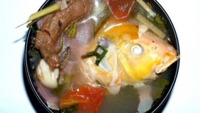 • نضع السّمك في طبق التقديم، ونضيف إليه الصّلصة، ونزينه بالثّوم القصبيّ.