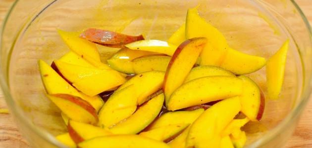 - نغسل المانجو ونقشرها، ونقطعها إلى قطع طوليّة.