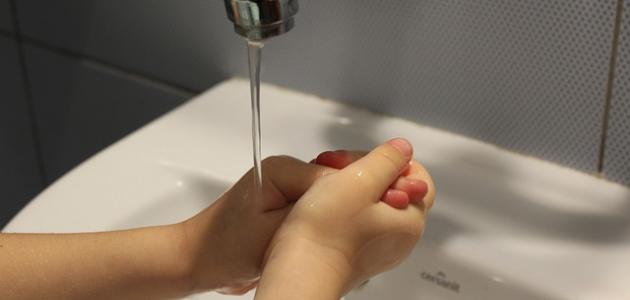- ترطيب اليدين بمياه نظيفة جارية (دافئة أو باردة)، ثم وضع الصابون في راحة اليد.