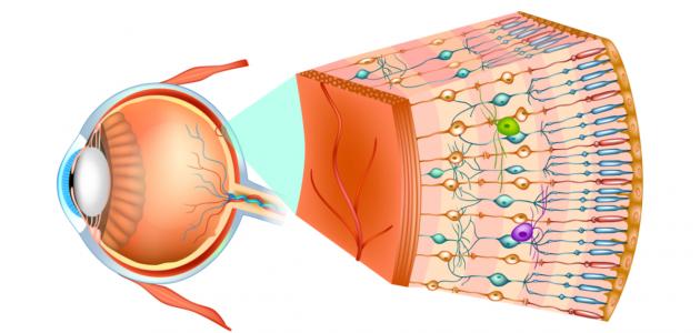 - طبقة الشبكية: وتُبطّن الشبكية المشيمة وتحتوي على نقطةٍ يدخل منها العصب البصري، وتسمّى النقطة العمياء، وتتجمّع فيها الأشعة المتجمعة من القرنيّة.
