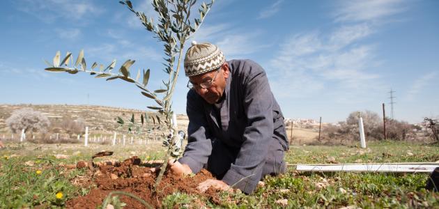 - حفر حفرة بحجم الوعاء المزروع فيه غرسة الزيتون.