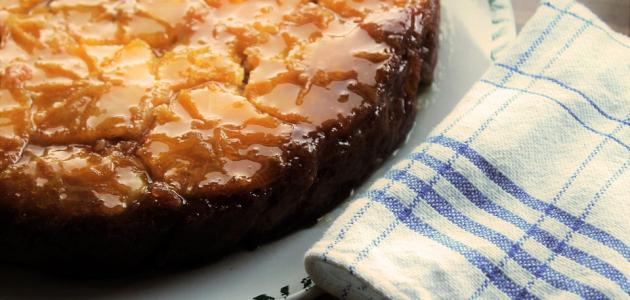 • إخراج الكيك من الفرن، وترك الكيك بالقالب حتى يبرد لبضع دقائق ثمّ قلبه على طبق للتقديم عالي الحافة.
