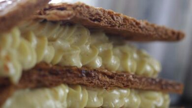 سكبُ خليطِ المهلبيّةِ على البسكويتِ مع التقليبِ بحركاتٍ خفيفةٍ باستعمالِ ملعقةٍ خشبيّةٍ ليتشرَّبَ البسكويتُ المهلبيّة.