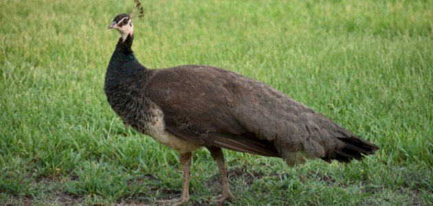 - تتميز أنثى الطاووس باللون البني، وبطنها أبيض اللون، وعنقها أخضر اللون، ولها عرف عند الرأس.[٥]