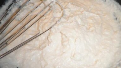 - نحضر الحشو بخلط الجبنة مع القشطة، ثمّ نسكب الجبنة فوق التوست، ويجب أن لا تصل الجبنة للأطراف.