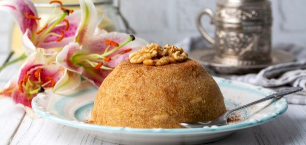 4. وضع الخليط في طبق التقديم، وتزيينه بالمكسرات، ويقدم ساخناً.