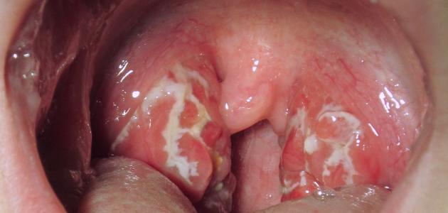 - ظهور نقاط أو ما يُشبه الأغطية ذات اللون الأبيض أو الأصفر فوق اللوز الملتهبة.