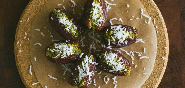 - ترتيب التمر المحشو بطبق التقديم ورش عليها فتات الحليب والفستق الحلبي المفروم وتقديمه.