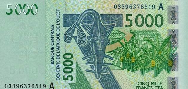 - فئةُ (5,000) فرنك غرب أفريقيّ: وقد طرحها البنكُ المركزيُّ في عامِ ألفين وثلاثةٍ، وهي تميلُ إلى اللونِ الأخضرِ.