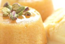 - وضع الخليط فوق بلاستيك في قالب، ثمّ توزيع اللوز والفستق عليه حسب الذوق.