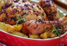 - ضعي الخضار في صينية الفرن، ثم أضيفي الدجاج، وصوص الجبنة والقشطة فوقها، ثم دعيها حتى تنضج وتحمرّ.