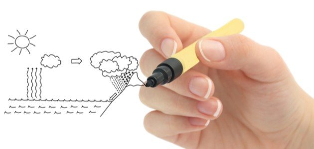 • عندما يتصاعد بخار الماء في الجو يبرد، وتسخن الشمس بدورها الهواء القريب من سطح الأرض وعندما ترتفع درجة الهواء يصبح وزنه خفيفاً فيرتفع إلى الأعلى ليلتقي بالهواء البارد، وعندها يحدث التكاثف وتتشكل السحب والغيوم.
