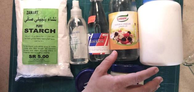 • خلط نشأ الذرة مع الغراء الأبيض، والخل الأبيض، والزيت النباتي، والجليسرين في قدر عميق.