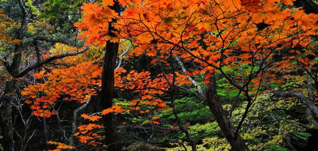 - يتغير لون الأوراق في فصل الخريف من اللون الأخضر إلى الأصفر والبرتقالي، وهو الفصل الذي تتساقط فيه أوراق الأشجار.[٨]