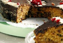 - سكب الخليط في قالب كيك مجهّز، وخبزه على الرف الأوسط للفرن على درجة حرارة مئة وثمانين مئوية لمدّة نصف ساعة، مع الحرص على عدم فتح الفرن أثناء خبز الكيك حتى لا يهبط.