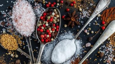 - ملعقتان صغيرتان من كلٍّ من: الملح، والفلفل الأسود المطحون، وحبوب السمسم المحمصة.