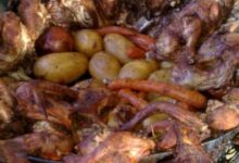 - نزيل الدجاج من المرق، مع الحرص على الاحتفاظ بالمرق جانباً، ثم نضعه في صينيّة مخصّصة للفرن مدهونة بالزيت، ثم ندخله إلى فرن متوسط الحرارة لمدة عشرين دقيقة أو حتّى يحمر.