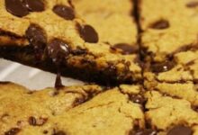• نخرج قالب البسكويت من الثلّاجة، ونتركه جانباً مدّة ربع ساعة، ثمّ نقطّعه، ونقدّمه.