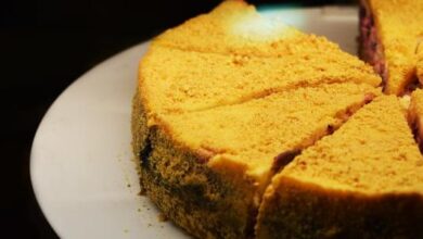 - إخراج الكيك من الفرن ووضع القالب على شبك معدني لعدة دقائق الى أن يصبح بارداً ثمَّ قلبه على طبق تقديم.