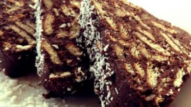 • نضغط بخفّة على قطع الكيك حتى تتماسك مع الكريمة، ثم توضع في الثّلاجة حتى تتماسك.