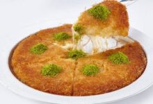 - قطعي الكنافة الكذابة على شكل مربعات متوسطة الحجم وقدميها وهي ساخنة، مع إضافة المزيد من الفستق الحلبي المطحون على الوجه.