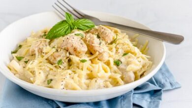 • نسلق المعكرونة في الماء الساخن المملّح، والمضاف له زيت، ونضع معها مكعّباً من مرق الدجاج في وعاءٍ على النار، ثمّ نصفّيها.