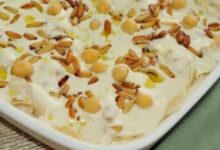 - نضع الصنوبر في مقلاة ونحمره حتى يصبح ذهبياً، ثمّ نرفعه عن النار ونوزعه على وجه داود باشا.