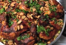- تصفية المرق ووضع الدجاج داخل طبق فرن واسع.