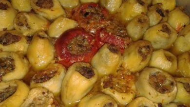 • نضع اللحم المطهو، ونحشو البطاطا ونضعها بالصينية بعد دهنها بالزبدة.